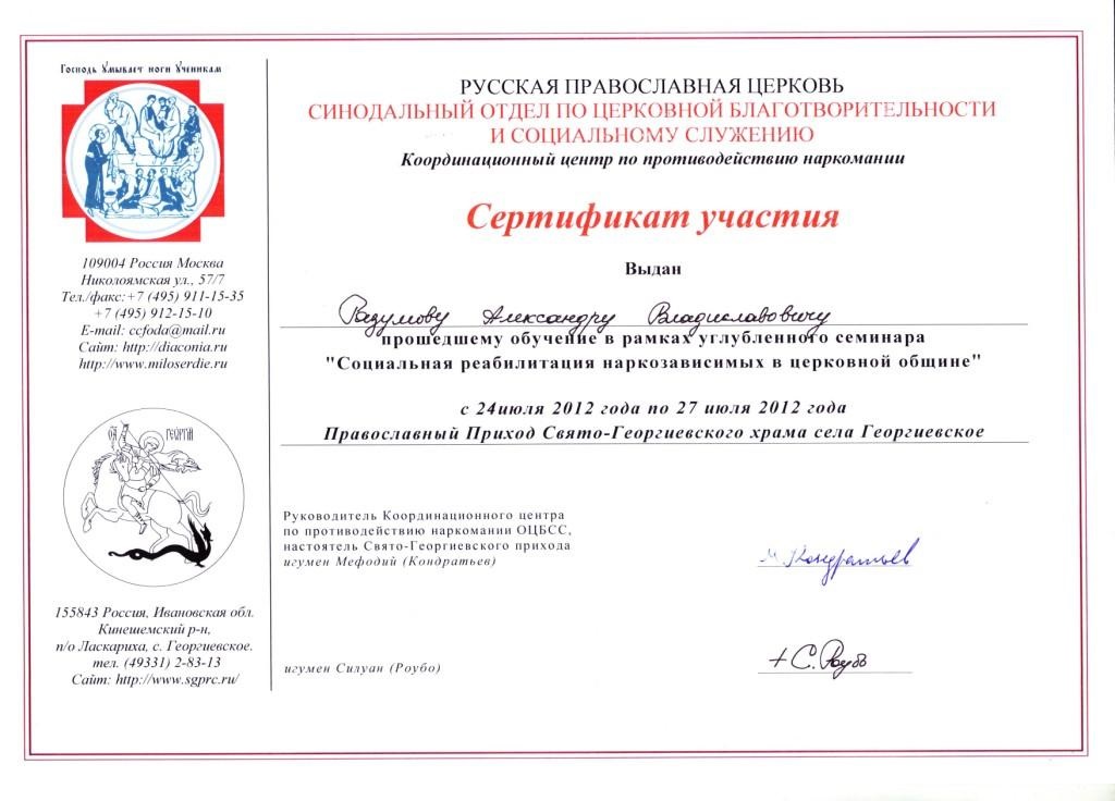 Епархиальный координатор по проведению работ за утверждение трезвости и профилактике алкоголизма, руководитель реабилитационного центра при храме Иверской иконы Божией Матери, ведущий группы самопомощи для зависимых. Образование: Ярославский государственный педагогический университет им. К.Д. Ушинского, программа обучающих семинаров по проблемам зависимости Благотворительного фонда святого праведного Иоанна Кронштадтского;