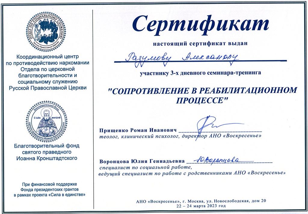 Все сотрудники реабилитационного центра являются участниками регулярных семинаров, посвященных борьбе с зависимостями